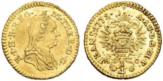"HEILIGES ROMISCH REICH, Joseph II. 1765-1790. 1/4 Dukat 1772 GA, Karlsburg. Münzmeister Anton Joseph Hammerschmidt, Wardein Alexander de Gogia. Selten. Vorzüglich. Feine Kratzer auf der Vorderseite. (Austria, Joseph II, 1765-90, quarter ducat of 1772, Karlsburg mint. Rare, Extremely fine, Minor hairlines on obverse.)"