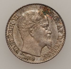 This specimen was lot 22445 in Heritage sale 3010 (Boston, August 2010), where it sold for $149.50. The catalog description[1] noted, "Frederick VII 5 Cents 1859, AU-UNC, far nicer than usual for the type." This type was issued 1858-59 along with one, three, ten and twenty cent coins.