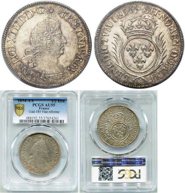"FRANCE, Royaume, Louis XIV (1643-1715), AR demi-écu aux palmes, 1694AA, Metz. 2e réformation. D/ B. cuir. à d. R/ Ecu de France rond, couronné, entre deux palmes. Gradé PCGS AU55. Très Beau à Superbe. Provient de la collection Teitgen, Paris, 26-28 octobre 2015, 900. (kingdom of France, Louis XIV, 1643-1715, silver half écu of the palms of 1694, Metz mint, second reformation. Obverse: cuirassed bust right; reverse: crowned round arms of France between two palms. Very Fine - Extremely Fine.)"
