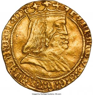 "Spain: Navarre. Ferdinand II of Aragon gold 2 Ducados (Doble Real de Oro) ND (1512-1516) AU55 NGC, Pamplona mint. FЄRnAn?VS: ?: G: R: nAVARRЄ: ЄT: AR, crowned, long-haired bust of Ferdinand right / SIT: nOmЄn: ?OmIn: BЄnЄ?ITVm: ЄS:, crowned arms of Navarre with double border. An exceptionally rare type minted by Ferdinand the Catholic (Ferdinand II of Aragon, and Ferdinand V of Castile) following his summer invasion of Navarre and the subsequent capitulation of Pamplona on July 24, 1512, with only an extremely tiny handful of examples having appeared on the market in recent decades. Left unvalued by Calicó in the 2019 edition of his Numismática Española and entirely missing from Crusafont, Balaguer, and Grierson's catalog of the Fitzwilliam Museum collection, the issue is almost impossible to locate in appreciable states of preservation, most coming badly bent, poorly struck, or otherwise heavily handled (see, for instance, the example plated by Cayón). As such, locating a piece at this level, particularly with such clear reverse legends, is a very special opportunity indeed. To date, the sole example yet certified, and an exquisite find on the whole."