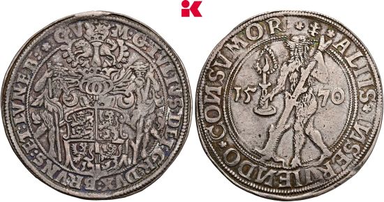 "BRAUNSCHWEIG-WOLFENBÜTTEL, FÜRSTENTUM Julius, 1568-1589. Reichstaler 1570, Goslar. Lichttaler. Sehr schön. (Germany, duchy of Brunswick-Wolfenbüttel, Julius 1568-89, "light" thaler of 1570, Goslar mint. Very fine.)"