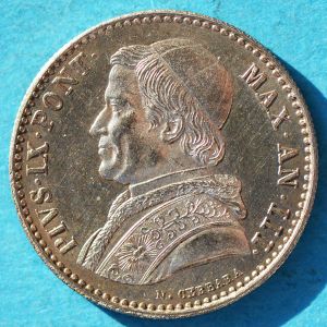 | + | [[Image:Papal States 1848R 20 baiocchi obv DSLR.jpg|300px|thumb|from the Mountain Groan Collection]] | ||