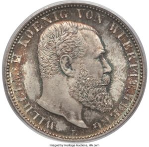 | − | This specimen was lot 34099 in Heritage sale 3067 (Long Beach, September 2018), where it sold for $240. The catalog description<sup>[1]</sup> noted, "[[Germany|German States]]: [[German States, Wurttemberg|Württemberg]]. Wilhelm II 2 Mark 1908-F MS66 PCGS, Stuttgart mint. An argent-hued beauty with charcoal accents giving a singular pop to the devices russet sunset tones scattered with cobalt. The reverse is fully in bloom with summery colors, making the visual allure hardly resistable. From the Feeling Good Collection." The silver two mark replaced the old gulden (10.58 g, .900 fine) struck in south Germany prior to unification. This two mark piece was struck at the Stuttgart mint (mintmark "F") for the kingdom of Württemberg, a member of the German Empire. This type was struck 1892-93, 1896-1908, 1912-14 along with silver three and five mark and gold ten and twenty mark pieces. The two mark is common. | + | This specimen was lot 34099 in Heritage sale 3067 (Long Beach, September 2018), where it sold for $240. The catalog description<sup>[1]</sup> noted, "[[Germany|German States]]: [[German States, Wurttemberg|Württemberg]]. Wilhelm II 2 Mark 1908-F MS66 PCGS, Stuttgart mint. An argent-hued beauty with charcoal accents giving a singular pop to the devices russet sunset tones scattered with cobalt. The reverse is fully in bloom with summery colors, making the visual allure hardly resistable. From the Feeling Good Collection." The silver two mark replaced the old gulden (10.58 g, 0.900 fine) struck in south Germany prior to unification. This two mark piece was struck at the Stuttgart mint (mintmark "F") for the kingdom of Württemberg, a member of the German Empire. This type was struck 1892-93, 1896-1908, 1912-14 along with silver three and five mark and gold ten and twenty mark pieces. The two mark is common. |