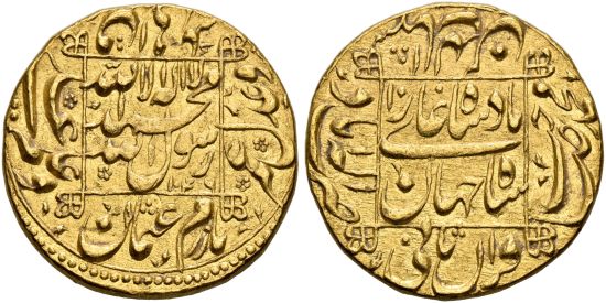 This specimen was lot 2452 in Sincona sale 77 (Zürich, May 2022), where it sold for 4,500 CHF (about US$5,642 including buyer's fees). The catalog description[1] noted, "INDIA | Mughal Empire. Shihab al-Din Muhammad Shah Jahan, 1037-1068 H. (1628-1658). Mohur 1046 H.Year 10, Alahabad. Selten in dieser Erhaltung. NGC MS62. Überdurchschnittlich gut ausgeprägt. (Rare in this condition, Extraordinarily well struck.)" This type is listed from twenty mints in India with regnal years 9-10 and 15-21. The Mughal Empire dominated India during the seventeenth century but broke up in the eighteenth century under external attack, Hindu rebellion and civil war. This collapse allowed European colonizers entry into the subcontinent and eventual British control.