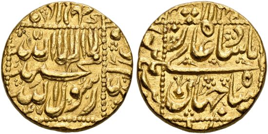 This specimen was lot 2453 in Sincona sale 77 (Zürich, May 2022), where it sold for 2,800 CHF (about US$3,399 including buyer's fees). The catalog description[1] noted, "INDIA | Mughal Empire. Shihab al-Din Muhammad Shah Jahan, 1037-1068 H. (1628-1658). Mohur 1047 H. Burhanpur. NGC MS62. Überdurchschnittliche Erhaltung. (Extraordinary condition.)" This type is listed from twenty mints in India with regnal years 4-32. This particular issue lacks the regnal year. The Mughal Empire dominated India during the seventeenth century but broke up in the eighteenth century under external attack, Hindu rebellion and civil war. This collapse allowed European colonizers entry into the subcontinent and eventual British control.