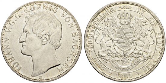 "DEUTSCHLAND | Sachsen, Königreich, Johann, 1854-1873. 2 Vereinstaler 1861 B, Dresden. Vorzüglich-FDC. (Germany, kingdom of Saxony, John I, 1854-73, double union thaler of 1861, Dresden mint. Extremely fine-uncirculated.)"