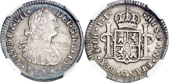 This specimen was lot 1713 in Aureo y Calicó sale 423 (Barcelona, December 2023), where it did not sell. The catalog description[1] noted, "1814. Fernando VII. Santiago. FJ. 1 real. Graded NGC as XF Details Cleaned, no. 2900515-004. Attractive. Val and Mexía Collection. Very scarce in this condition. MBC/MBC+ [very fine or better]." This type was struck at Santiago 1808-17 in limited numbers but enough were saved that it is not rare. The bust of Charles IV was used on the one real, four reales, one escudo and eight escudos while the standard bust of Ferdinand was used on the two reales and eight reales. The Spanish were expelled in 1817 but the first republican real did not appear until 1834. Some colonial types were restruck by the republicans during the early 1820's; it is not known if this denomination was included.