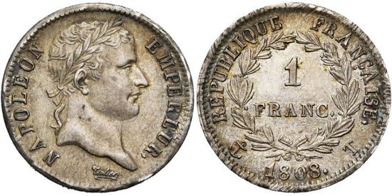 "FRANCE, Napoléon Ier (1804-1814), 1 franc, 1808T, Nantes. Petits coups sur la tranche. Belle patine. Très Beau à Superbe. (empire of France, Napoleon I, 1804-14, one franc of 1808, Nantes mint. Minor rim nicks, nice toning, Very Fine - Extremely Fine.)"