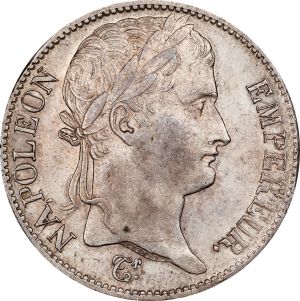 This specimen was lot 34109 in Stack's Bowers NYINC sale (New York, January 2025), where it sold for $600. The catalog description[1] noted, "FRANCE. Empire. 5 Francs, 1812-I. Limoges Mint. Napoleon I. PCGS AU-58. On the cusp of Mint State status, this charming crown glistens with great brilliance and sports an appealing gunmetal gray tone. From the Richard Margolis Collection." Shown is a Napoleonic five francs struck at the Limoges mint in 1809-14. The various designs of Napoleonic five francs form eight distinct types of which this is the seventh, struck 1809-14 with a complete set of this type comprising 86 date and mintmark combinations, some very rare. This date is fairly common for the type, being priced 45% higher than the common date (1811-A). It was officially withdrawn from circulation in 1928 and demonetized in 2005 but ceased to circulate in France after World War One.