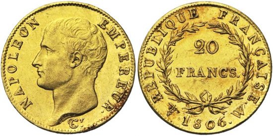 "FRANCE, Napoléon Ier (1804-1814), AV 20 francs, 1806W, Lille. Tête nue. 4.242 p. frappées. Très rare Fines griffes. Bel exemplaire avec brillant de frappe original. Superbe. (France, Napoleon I, 1804-14, gold twenty francs of 1806, Lille mint, bare head, 4,242 pieces struck. Very rare, a few scratches, nice example with original luster, Extremely Fine.)"