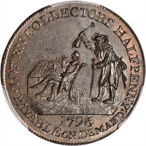 This specimen was lot 21087 in Stack's Bowers ANA sale (Chicago, August 2019), where it sold for $780. The catalog description[1] noted, "GREAT BRITAIN. Middlesex. 1/2 Penny Token, 1796. Denton's. PCGS MS-64 Brown Gold Shield. Denton's Collectors' Halfpenny. Obverse: Collector, smoking pipe, seated left at table covered with coins and medals; to right, old man placing a fool's cap on the collector's head; Reverse: Two boys racing on asses right with ASSES RUNNING FOR HALFPENCE; Edge Lettering: ANY SUM GIVEN FOR SCARCE IMPRESSIONS. Deep chocolate surfaces, with some hints of peripheral red. An exceptional, problem free example of this numismatically interesting satirical token -- one of the most famous in the series. From Jerry Bobbe in 2001, a token hand selected for quality; the Q. David Bowers Collection."