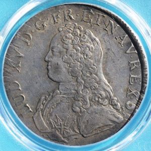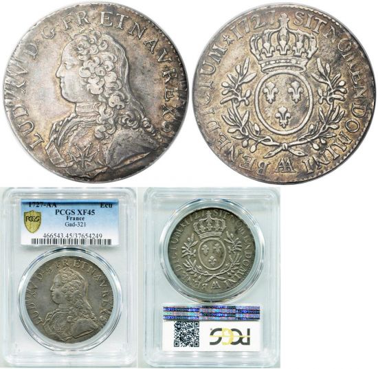 "FRANCE, Royaume, Louis XV (1715-1774), AR écu aux rameaux d'olivier, 1727AA, Metz. D/ B. habillé à g., décoré de la croix du Saint-Esprit. R/ Ecu de France couronné, entre deux rameaux d'olivier. Gradé PCGS XF45. Très Beau. Provient de Schulman, 1989 et de la collection Teitgen, Paris, 26-28 octobre 2015, 935. (kingdom of France, Louis XV, 1715-74, silver écu of the olive branches of 1727, Metz mint. Obverse: uniformed bust left, decorated with the cross of the Holy Spirit; reverse: crowned arms of France between two olive branches. Very Fine.)"