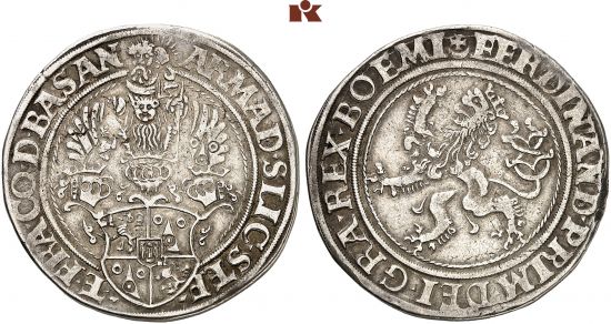 | − | This specimen was lot 4885 in Künker sale 335 (Osnabruck, Germany, March 2020), where it sold for €4,000 (about US$5,235 including buyer's fees). The catalog description<sup>[1]</sup> noted, <blockquote>"''RÖMISCH-DEUTSCHES REICH. DIE ÖSTERREICHISCHEN STANDESHERREN, SCHLICK, GRAFEN, Stephan, Burian, Heinrich, Hieronymus und Lorenz, 1505-1532. 1/2 Taler 1527, Joachimstal, mit Titel Ludwigs II. König von Ungarn und Böhmen. Ausbeute der Joachimstaler Gruben. Mit Münzzeichen Kreuz über Halbmond (Utz Gebhart). RR Feine Patina, kl. Randfehler, sehr schön.'' ([[Austria|Holy Roman Empire]], counts of Schlick, Stephen, Burian, Henry, Jerome and Laurence, 1505-32, half thaler of 1527, Joachimsthal mint, in the name of Louis II, king of Hungary and Bohemia, for the Joachimsthal mines. Rare, fine patina, rim defects, very fine.)"</blockquote> Altho the auctioneers attribute this to king Lajos II, the coin clearly states "FERDINAND·PRIM·DEI· GRA·REX·BOEMI+", i.e., the Hapsburg Ferdinand I, king of Hungary 1527-64 and Holy Roman Emperor 1558-64. | + | This specimen was lot 4885 in Künker sale 335 (Osnabruck, Germany, March 2020), where it sold for €4,000 (about US$5,235 including buyer's fees). The catalog description<sup>[1]</sup> noted, <blockquote>"''RÖMISCH-DEUTSCHES REICH. DIE ÖSTERREICHISCHEN STANDESHERREN, SCHLICK, GRAFEN, Stephan, Burian, Heinrich, Hieronymus und Lorenz, 1505-1532. 1/2 Taler 1527, Joachimstal, mit Titel Ludwigs II. König von Ungarn und Böhmen. Ausbeute der Joachimstaler Gruben. Mit Münzzeichen Kreuz über Halbmond (Utz Gebhart). RR Feine Patina, kl. Randfehler, sehr schön.'' ([[Austria|Holy Roman Empire]], counts of Schlick, Stephen, Burian, Henry, Jerome and Laurence, 1505-32, half thaler of 1527, Joachimsthal mint, in the name of Louis II, king of Hungary and Bohemia, for the Joachimsthal mines. Rare, fine patina, rim defects, very fine.)"</blockquote> Altho the auctioneers attribute this to king Lajos II, the coin clearly states "FERDINAND·PRIM·DEI· GRA·REX·BOEMI+", i.e., the Hapsburg emperor Ferdinand I, king of Hungary 1527-64 and Holy Roman Emperor 1558-64. |