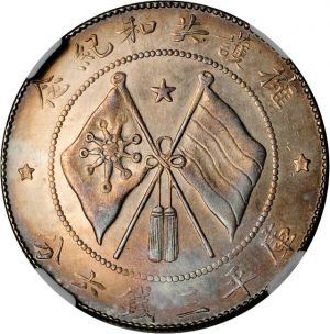 The specimen shown was lot 60734 in Ponterio sale 162 (Hong Kong, August 2011), where it sold for US$ 9,560. The catalog description[1] noted, "CHINA. Yunnan. 3 Mace 6 Candareens (50 Cents), ND (1916). 唐繼堯擁護共和紀念三錢六分銀幣。Scarce in this grade. 側面像。少見的佳品。NGC MS-62. Ex: The Frank Robinson Collection.”