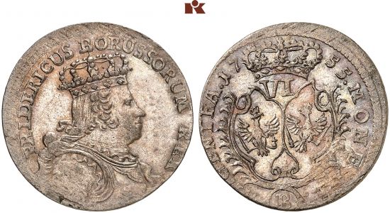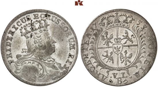 "BRANDENBURG-PREUSSEN, PREUSSEN, KÖNIGREICH, Friedrich II. der Große, 1740-1786. 6 Kreuzer 1755, B, Breslau. Prägung für die Provinz Schlesien. Sächsisch-polnischer Typ. RR Min. Schrötlingsfehler, fast vorzüglich. Exemplar der Slg. Manfred Olding, Auktion Fritz Rudolf Künker 10, Osnabrück 1988, Nr. 500. (Germany, kingdom of Prussia, Frederick II the Great, 1740-86, six kreuzer of 1755, Breslau mint, struck for the province of Silesia, Saxon-Polish type. Very rare, minor flaws, about extremely fine.)"
