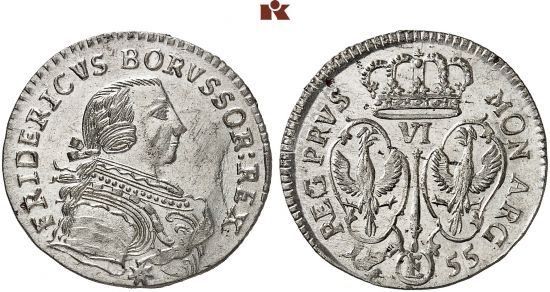 | − | This specimen was lot 3634 in Künker sale 353 ( | + | This specimen was lot 3634 in Künker sale 353 (Osnabrück, Germany, September 2021), where it sold for €150 (about US$209 including buyer's fees). The catalog description<sup>[1]</sup> noted, <blockquote>"''BRANDENBURG-PREUSSEN, PREUSSEN, KÖNIGREICH, Friedrich II. der Große, 1740-1786. 6-Gröscher 1755, E, Königsberg. Prägung für die Provinz Preußen. Mit FRIDERICVS BORVSSOR REX in der Vorderseitenumschrift und PRVS in der Rückseitenumschrift. Winz. Schrötlingsfehler, vorzüglich. Exemplar der Auktion Fritz Rudolf Künker 25, Osnabrück 1993, Nr. 1777.'' ([[Germany]], [[German States, Prussia|kingdom of Prussia]], Frederick II the Great, 1740-86, six groscher of 1755, Königsberg mint, struck for the province of Prussia, with "PRVS" in the reverse legend. Minor field marks, extremely fine.)"</blockquote> The six groscher and the accompanying three groscher and eighteen groscher were used in East Prussia and the neighboring parts of Poland. This type of 1753-57 was the first of the denomination minted since 1723. The Königsberg mint also struck other six groscher with a crowned bust ([[Prussia 1755-E 6 groscher KM-B279|KM B279]] and [[Prussia 1755-E 6 groscher KM-C279|KM C279]]) in 1755, which are considerably scarcer. |