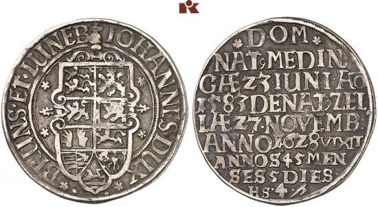 "BRAUNSCHWEIG UND LÜNEBURG, BRAUNSCHWEIG-LÜNEBURG, FÜRSTENTUM, Christian, Bischof von Minden, 1611-1633. 1/4 Reichstaler 1628, Clausthal, auf den Tod seines Bruders Johann am 27. November. Von großer Seltenheit. Attraktives Exemplar mit hübscher Patina, sehr schön. Aus der Sammlung eines Ingenieurs. Exemplar der Slg. Dr. Werner Koch, Teil 1, Auktion Dr. Busso Peus Nachf. 273, Frankfurt/Main 1970, Nr. 549 und der Auktion LHS Numismatik 100, Zürich 2007, Nr. 831. (Germany, duchy of Brunswick-Luneburg-Celle, Christian, bishop of Minden, 1611-33, quarter thaler of 1628, Clausthal mint, on the death of his brother John on November 27. Extremely rare, attractive example with handsome patina, very fine.)"