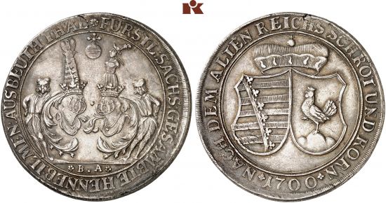 − | This specimen was lot 5790 in Künker sale 354 ( | + | This specimen was lot 5790 in Künker sale 354 (Osnabrück, Germany, September 2021), where it sold for €1,700 (about US$2,366 including buyer's fees). The catalog description<sup>[1]</sup> noted, <blockquote>"''HENNEBERG, GRAFSCHAFT, Gemeinschaftlich sächsischer Anteil. Reichstaler 1700, Ilmenau. Ausbeute der Gruben in Ilmenau. Feine Patina, fast vorzüglich.'' ([[Germany]], county of Henneberg, joint Saxon rule, thaler of 1700, Ilmenau mint, for the Ilmenau mines. Fine patina, about extremely fine.)"</blockquote> The counts of Henneberg fell extinct in 1580, after which the county was co-ruled by various Saxon dukes. In this period, the rulers were [[German States, Saxe-Gotha|Saxe-Gotha]] and [[German States, Saxe-Weimar-Eisenach|Saxe-Weimar]]. This type was struck 1700-02, the issues of 1701 and 1702 are catalogued as [[Henneberg-Ilmenau 1702-BA thaler Dav-2726|Dav-2726]]. |