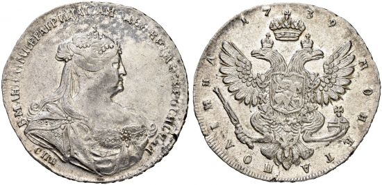 − | The first specimen was lot 50 in Sincona sale 65 ( | + | The first specimen was lot 50 in Sincona sale 65 (Zürich, October 2020), where it sold for 1,400 CHF (about US$1,843 including buyer's fees). The catalog description<sup>[1]</sup> noted, <blockquote>"Poltina 1739, St. Petersburg Mint. Rare. 2 roubles according to Petrov. 3 roubles according to Ilyin. Extraordinary condition. Extremely fine. (''Полтина 1739, СПб МД. 12,72 г. Дьяков 4. Биткин 246 (R). Редкая. 2 рубля по Петрову. 3 рубля по Ильину. Исключительная сохранность. Состояние отличное.'')"</blockquote> The second specimen was lot 1168 in Sincona sale 69 (Zürich, May 2021), where it did not sell. The catalog description<sup>[2]</sup> noted, <blockquote>"''RUSSLAND. Anna Iwanovna, 1730-1740. Poltina 1739, St. Petersburg. Diakov 7. Selten. Gutes sehr schön.'' (empire of [[Russia]], Anna, 1730-40, poltina of 1739, St. Petersburg mint. Rare, Good very fine.)"</blockquote> This type was struck 1737-40 at the Red Mint in Moscow ([[Russia 1738 poltina|KM 199.1]], without mintmark) and St. Petersburg (shown here). Both are scarce. |