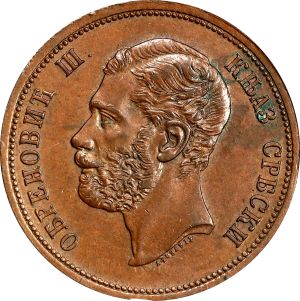 This specimen was lot 74587 in Stack's Bowers Collector's Choice sale (Costa Mesa, CA, February 2023), where it sold for $336. The catalog description[1] noted, "SERBIA. 10 Para, 1868. Vienna Mint. Obrenovich Michael III. NGC MS-62 Brown. Quite elusive in Mint State, this example displays a refined strike and glossy milk chocolate surfaces." Altho the para is a Turkish denomination (forty para made a kurush), when Serbia commenced coinage in 1868, French modules were used, with the dinar equal to the French franc. One, five and ten para were struck in bronze; other denominations were added later. The quantity made was likely more than the country could absorb and no more were struck until 1879, by which time Milan had succeeded Michael III.