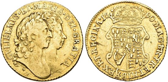 | − | This specimen was lot 1188 in Sincona sale 79 ( | + | This specimen was lot 1188 in Sincona sale 79 (Zürich, October 2022), where it sold for 2,100 CHF (about US$2,517 including buyer's fees). The catalog description<sup>[1]</sup> noted, "[[Great Britain|GREAT BRITAIN]] | Königreich, William III. and Mary, 1689-1694. Guinea 1690, London. Conjoined busts. NGC XF Details. Minor scratches below bust, lightly cleaned." This type was struck 1689-94 with ([[Great Britain 1689 guinea Fr-305|Fr-305]]) and without (shown here) the elephant and castle symbol below the busts. |