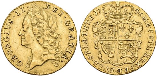 | − | This specimen was lot 1265 in Sincona sale 79 ( | + | This specimen was lot 1265 in Sincona sale 79 (Zürich, October 2022), where it sold for 1,000 CHF (about US$1,199 including buyer's fees). The catalog description<sup>[1]</sup> noted, "[[Great Britain|GREAT BRITAIN]] | Königreich, George II. 1727-1760. 1/2 Guinea 1745, London. Intermediate laureate head. NGC AU Details. Lightly cleaned." This bust was used on the half guinea 1740 and 1745-46. Half guineas of 1745 exist with "LIMA" below the bust ([[Great Britain 1745 1/2 guinea Fr-348|Fr-348]]); those bring double the price of the plain type shown here. Guineas were superseded by sovereigns during the reform of 1817.   |