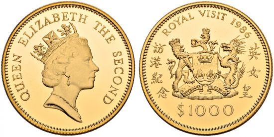 − | This specimen was lot 551 in Sincona sale 54 ( | + | This specimen was lot 551 in Sincona sale 54 (Zürich, May 2019), where it sold for 650 CHF (about US$774 including buyer's fees). The catalog description<sup>[1]</sup> noted, <blockquote>"''Elizabeth II. 1952-2007. 1000 Dollar 1986. Royal Visit. Polierte Platte. FDC.'' (Hong Kong, Elizabeth II, 1952-2007, one thousand dollars of 1986, for the royal visit. Choice Proof.)"</blockquote> Hong Kong commenced a series of gold commemoratives featuring the animals of the Chinese zodiac. This one honors a Royal Visit. Another NCLT honored the year of the Tiger ([[Hong Kong 1986 1000 dollars KM-54|KM 54]]). British coinage for Hong Kong ceased in 1997 when the island was returned to China. |