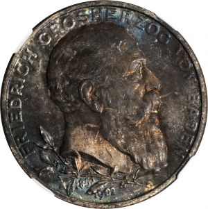 This specimen was lot 3605 in Stacks-Bowers NYINC sale (New York, January 2015), where it sold for $364.25. The catalog description[1] noted, "GERMANY. Baden. 5 Mark, 1902. NGC MS-65. Golden Jubilee, 50th anniversary of the reign. Metallic toning with underlying luster. Very sharp details. An exceptional example of this popular type. From the Rockaway Collection." This commemorative is actually more available than the regular issue (Dav-535).
