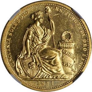 This specimen was lot 72863 in Stack's Bowers Collectors Choice Online Auction (Santa Ana, CA, May 2017), where it did not sell. The catalog description[1] noted, "PERU. 50 Soles, 1951. NGC MS-64. Sharply struck, bright and flashy." This denomination, struck 1950-69, was theoretically a circulating coin but actually was a bullion piece like her sisters, the gold five, ten, twenty and hundred soles.