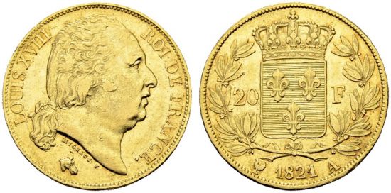 "Frankreich, Louis XVIII. 1814-1824. 20 Francs 1821 A, Paris. Seltener Jahrgang. Vorzüglich. (kingdom of France, Louis XVIII, 1814-24, twenty francs of 1821, Paris mint. Rare date, Extremely fine.)"