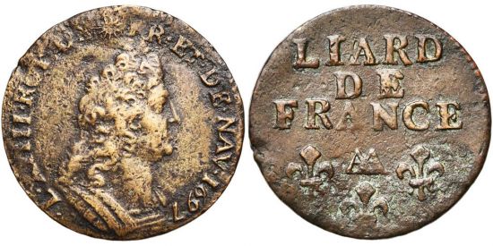 This type was struck 1693-1701 in large numbers at many mints. As the lowest value denomination, careless engraving, sloppy striking and wide variation in weight are common. Officially, no overstriking was allowed but some are known struck over liards au buste adolescent of 1655-58.