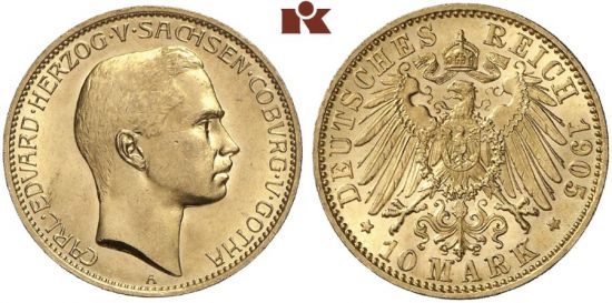 "SACHSEN-COBURG-GOTHA Carl Eduard, 1900-1918. 10 Mark 1905. Vorzüglich-Stempelglanz. (Germany, duchy of Saxe-Coburg-Gotha, Charles Edward, 1900-18, ten mark of 1905, extremely fine to uncirculated.)"