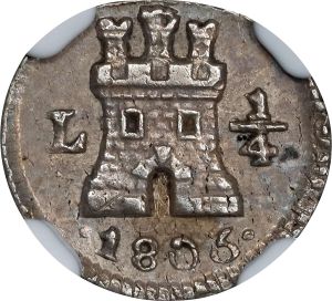 This specimen was lot 51213 in Stack's Bowers NYINC sale (New York, January 2024), where it sold for $360. The catalog description[1] noted, "PERU. 1/4 Real, 1805-L. Lima Mint. Charles IV. NGC Unc Details--Obverse Spot Removed. A sharp example with even golden-toned surfaces. Evidence of the spot removal, while faint, can be observed within the castle's arch. From the EMO Collection. Privately purchased from Freeman Craig." Two types of cuartillas were struck at the beginning of the series: KM 99 (portrait type) struck 1792-96 and KM 102.1 (lions/castles without value) struck 1794-96. Both are scarce compared to the regular lions and castles type struck 1796-1821, of which an example is shown here.