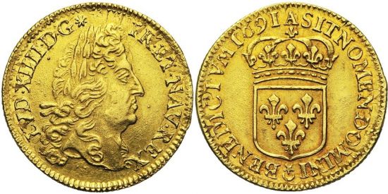"FRANCE, Royaume, Louis XIV (1643-1715), AV louis d'or à l'écu, 1691A, Paris. 1e réformation. D/ T. vieillie à d., coiffée d'une perruque laurée. R/ Ecu de France couronné. Très Beau à Superbe. (kingdom of France, Louis XIV, 1643-1715, gold louis of the shield of 1691, Paris mint, first reformation. Obverse: old peruked bust to right; reverse: crowned arms of France. Very fine to extremely fine.)"