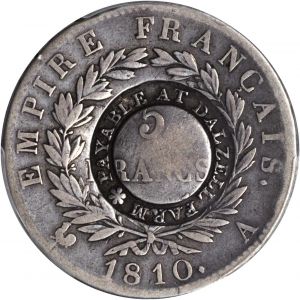 This specimen was lot 21363 in Stack's Bowers 2018 NYINC sale (New York, January 2018), where it sold for $900. The catalog description[1] noted, "SCOTLAND. Dalzell Farm 5 Shillings Countermark, ND (ca. 1820). PCGS VF-20 Secure Holder. Struck on a French 1810-A 5 Francs (Paris Mint). Even light silver gray with smooth surfaces. Trivial hairlines. Countermark boldly applied in its usual location at central reverse. Napoleon Five Francs are the typical undertype for this mark, all part of a consignment brought from Belgium to this Scottish farm by a soldier named Archibald Hamilton. Pleasing and RARE. Manvile lists 22 specimens, only two of which are recorded of this host date. Countermark grades: EXTREMELY FINE Details; host coin VF. Ex: Coin Galleries sale August 2009, lot# 5031; Ex: Stack's auction April 22, 2009, lot# 2324; Ex: Fritz Rudolf Kunker Auction 134 January 29, 2008, lot# 837." Scotland in the early nineteenth century was tearing into the Industrial Revolution and manufacturers were eager for coin to facilitate trade. As the Royal Mint could not keep up, many private issues appeared. French 5 francs circulated freely and many of these were countermarked; the SCWC records over a hundred different countermarks. Today they are all rare. This counterstamp is attributed to 1820.