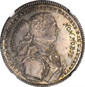 "GERMANY. Hohenlohe-Waldenburg-Schillingsfurst. 1/2 Taler, 1770-SNR. Nurnberg Mint. Karl Albrecht. NGC MS-64. 1/2 Convention Taler issue. A VERY SCARCE design type that always finds itself in short supply due to the eye-catching reverse design that displays a resurgent phoenix reanimating from the ashes. A lovely near-Gem thereof, this piece showcases rich toned surfaces that are dusky at times with moments of flashy brilliance that result from underlying reflectivity in the fields. The reverse is particularly spectacular, displaying vivid blue, purple and yellow toning accents around the phoenix and surrounding inscriptions. With eye-appeal this high, an item that will undoubted gain exhaled status in the next collection it enters. The "House of the Golden Flame" was founded on December 29, 1757 by Philipp Ernst, the head of the Catholic branch of the Hohenlohe side of the family. It originally served to facilitate a bond of friendship between his children (the eldest being Karl Albrecht who would succeeded him as leader), their closest relatives as well as their descendants. After Karl Albrecht became ruler, he renewed the order in 1770 under the "House and Knightly Order of the Phoenix" name and allowed the award to be bestowed upon foreigners who were able to prove nobility. Later in the 18th century, the order was again expanded to provide for class subdivision. Whimsically, nearly all information on the internet regarding this noble order is buried today due to J.K. Rowling's creation of an order of nearly identical name in her Harry Potter series of children's fiction novels. From the Linda Collection."