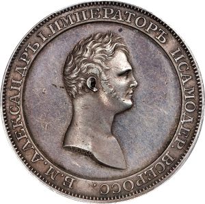 This specimen was lot 22207 in Stack's Bowers NYINC sale (New York, January 2023), where it sold for $26,400. The catalog description[1] noted, "Elegantly Toned and Original Ruble Pattern Novodel, RUSSIA. Silver Ruble Pattern Novodel, ND ("1808"). St. Petersburg Mint. Alexander I. PCGS SPECIMEN-55. Plain edge. A VERY RARE pattern Novodel striking that features a rather elongated bust of Alexander I, this pleasingly toned and only lightly handled example presents a great opportunity for the advanced collector of such issues. Displaying just a slight degree of wear upon the high points and some subtle cabinet friction in the fields, it exudes tremendous quality and mystique, with some burnished amber hints around the devices merely augmenting is strong eye appeal that much more. From the Sigma Collection." The regular issue ruble of 1808 featured the imperial eagle on the obverse and the value on the reverse. This is a novodel of a pattern featuring the tsar's portrait which was not adopted. Modern restrikes exist (KM X39) in silver, copper, pewter and gold, made in 2009.