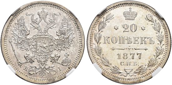 | − | This specimen was lot 3041 in Sincona sale 77 ( | + | This specimen was lot 3041 in Sincona sale 77 (Zürich, May 2022), where it sold for 100 CHF (about US$121 including buyer's fees). The catalog description<sup>[1]</sup> noted, "RUSSIA | [[Russia]]n Empire and Federation | Alexander II. 1855-1881. 20 Kopecks 1877, St. Petersburg Mint, SPB NI. NGC MS64." This type of 1867-93 and 1901-14 is common. It is reduced in weight and fineness from the type of 1860-66. |
