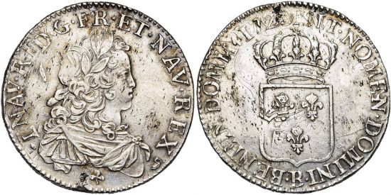"FRANCE, Royaume, Louis XV (1715-1774), AR écu de France, 1720B, Rouen. Réformation. D/ B. enfantin à d., l., dr. et cuir. R/ Ecu de France couronné. Rare Fines griffes. Très Beau. (kingdom of France, Louis XV, 1715-74, silver écu of France of 1720, Rouen mint, reformed. Obverse: laureate, draped and armored infant bust to right; reverse: crowned arms of France. Rare, fine scratches, Very Fine.)"