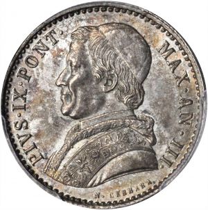 − | This specimen was lot 24232 in Stack's Bowers NYINC sale (New York, January 2018), where it sold for $156. The catalog description<sup>[1]</sup> noted, "ITALY. [[Vatican|Papal States]]. 20 Baiocchi, 1849-B Year-III. PCGS MS-63 Secure Holder. Sharply struck, toned and attractive." This type, struck 1848-56 from Rome and Bologna, is not listed as rare but seldom turns up. The edge lettering was updated mid-year on the anniversary of the reign of the pope, hence both "Anno III" and "Anno IV" are mentioned for 1849. The twenty baiocchi was one fifth of a scudo. The coinage was reformed to use centesimi and lire in 1867 but the Papal States were annexed by Italy in 1870 and the series ended. | + | This specimen was lot 24232 in Stack's Bowers NYINC sale (New York, January 2018), where it sold for $156. The catalog description<sup>[1]</sup> noted, "[[Italy|ITALY]]. [[Vatican|Papal States]]. 20 Baiocchi, 1849-B Year-III. PCGS MS-63 Secure Holder. Sharply struck, toned and attractive." This type, struck 1848-56 from Rome and Bologna, is not listed as rare but seldom turns up. The edge lettering was updated mid-year on the anniversary of the reign of the pope, hence both "Anno III" and "Anno IV" are mentioned for 1849. The twenty baiocchi was one fifth of a scudo. The coinage was reformed to use centesimi and lire in 1867 but the Papal States were annexed by Italy in 1870 and the series ended. |