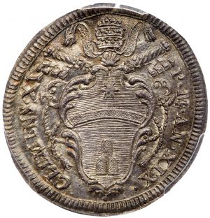 | − | This specimen was lot 2722 in Goldberg sale 109 (Los Angeles, January 2019), where it did not sell. The catalog description<sup>[1]</sup> noted, "Italian States: Papal/Roman States. Giulio (1719). Anno XIX. Clement XI. Beautifully toned gem with great eye-appeal. Rare. NGC graded MS-66." Berman lists fifteen different guilii for this pope; Berman-2415 has the reverse motto " | + | This specimen was lot 2722 in Goldberg sale 109 (Los Angeles, January 2019), where it did not sell. The catalog description<sup>[1]</sup> noted, "Italian States: Papal/Roman States. Giulio (1719). Anno XIX. Clement XI. Beautifully toned gem with great eye-appeal. Rare. NGC graded MS-66." Berman lists fifteen different guilii for this pope; Berman-2415 has the reverse motto "PRVDENTIA PRETIOSIOR EST ARGENTO" ("Prudence is more precious than silver", Proverbs 16:16). It was struck during year XIX. The giulio was ten baiocchi, while the [[Papal States (1715) piastra Dav-1448|piastra]], the Italian equivalent of the German thaler, was 105 baiocchi (3½ testone).   |