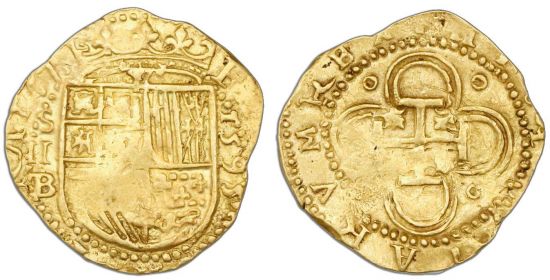 This specimen was lot 60 in Sedwick sale 25 (Winter Park, FL, May 2018), where it sold for $1,904. The catalog description[1] noted, "Seville, Spain, cob 2 escudos, 1595 date to right, assayer B below mintmark S and denomination II to left. Broad flan with choice full date (the last digit possibly punched over a 4) and S-II-B and crown (some die rust on that side), full shield and cross, XF with some central weakness." This type was struck 1588-97 and also comes undated. Cob two escudos were also struck at Burgos, Cuenca, Granada, Toledo, Valladolid and Segovia.