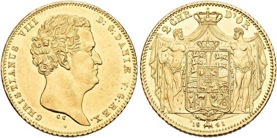 "DENMARK. Christian VIII. 1839-1848. 2 Christian d'or 1841, Kopenhagen. Mit der Signatur CC (Christen Christensen, Stempelschneider in Kopenhagen). Münzmeister Georg Wilhelm Svendsen. Selten. Gutes vorzüglich. NGC AU58. (kingdom of Denmark, Christian VIII, 1839-48, double christian d'or of 1841, Copenhagen mint, with engraver's initials "CC". Rare, Good extremely fine.)"