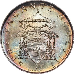This specimen was lot 32578 in Stack's Bowers Collector's Choice sale (Costa Mesa, CA, May 2024), where it sold for $105. The catalog description[1] noted, "ITALY. Papal (Vatican City). 500 Lire, 1958. Rome Mint. Sede Vacante. PCGS MS-66+. This charming premium Gem delivers stunning rich tone, with a general vibrance and handsome underlying luster." In 1860, the king of Sardinia succeeded in unifying the Italian peninsula after centuries of fragmentation. The Papal States, protected by a French army, were not incorporated until 1870. The pope, denouncing the occupation of his domain, withdrew into the Vatican palace as a self-declared prisoner. Normal relations with the Italian government were not restored until Mussolini signed a concordat in 1929, granting the Pope sovereignty over Vatican City. Coinage began that year, struck at the Rome mint. Coins are issued for the Vatican City in symbolic amounts but as they are eagerly saved as souvenirs by tourists, they are not in short supply for collectors. This type, struck in 1958 for the interregnum between Pius XII and John XXIII, is common. It was the only issue of this sede vacante, which lasted less than a month. This denomination was also struck for Pius XII in 1958 (KM 56). The lira was retired in 1999 when Italy joined the euro.
