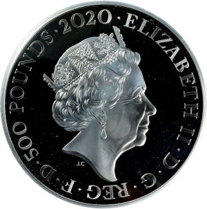 This specimen was lot 51127 in Stack's Bowers ANA sale (Pittsburgh, PA, August 2023), where it sold for $1,800. The catalog description[1] noted, "GREAT BRITAIN. Silver 500 Pounds (Kilo), 2020. Llantrisant Mint. Elizabeth II. GEM PROOF. From the popular James Bond/007 series of commemorative issues, this massive specimen features the iconic Aston Martin DB5 with license plate BMT-216A. Immensely elegant and refined, with a great deal of argent frosting and mirrored brilliance in the fields. Housed in original box of issue, along with plate attesting to serial number (35) and certificate of authenticity." This, like many recent British NCLT's, is missing from the SCWC.