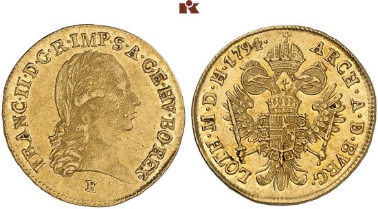 "RÖMISCH-DEUTSCHES REICH, Franz II. 1792-1804. Dukat 1794, E, Karlsburg. GOLD. Fast vorzüglich. Erworben 1996 bei der Firma M. Meister. (Holy Roman Empire, Francis II, 1792-1804, ducat of 1794, Karlsburg mint. About extremely fine.)"