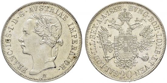 | − | This specimen was lot 4212 in Sincona sale 39 ( | + | This specimen was lot 4212 in Sincona sale 39 (Zürich, May 2017), where it sold for 180 CHF (about US$216 including buyer's fees). The catalog description<sup>[1]</sup> noted, <blockquote>"''AUSTRIA, Franz Joseph I. 1848-1916 20 Kreuzer 1852 A. Wien Kopf nach links. FDC.'' (empire of Austria, Francis Joseph I, 1848-1916, twenty kreuzer of 1852, Vienna mint, head to left. Uncirculated.)"</blockquote> The twenty kreuzer shown here was struck in 1852 at Vienna and Prague. A redesigned type (KM 2211, bust right) was struck 1852-56 at four mints. It was 4.32 g, 0.900 fine silver, and had the same amount of silver. The "bust right" type is common in all grades. |