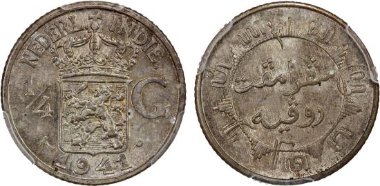 This specimen was lot 2148 in Stephen Album sale 43 (Santa Rosa, CA, May 2022), where it sold for $48. The catalog description[1] noted, "NETHERLANDS EAST INDIES: Wilhelmina, 1890-1948, AR ¼ gulden, 1941-P, WWII issue struck at the United States Mint, Philadelphia, a superb lustrous example! PCGS graded MS65, ex Joe Sedillot Collection." This type was struck in the Netherlands 1937-39 and in the United States 1941-42 and 1945, the Netherlands being under German occupation. In 1949, the Dutch gave up their attempt to reconquer their colony and Indonesia obtained its independence.
