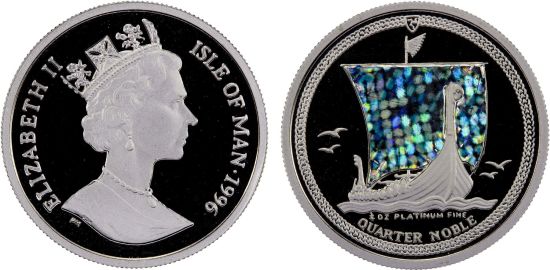 This specimen was lot 1064 in Stephen Album sale 50 (Santa Rosa, CA, September 2024), where it sold for $360. The catalog description[1] noted, "ISLE OF MAN: Elizabeth II, 1952-2022, 1/4 noble, Pobjoy Mint, 1996, Viking Longboat - Platinum Bullion Series, with 1/4 ounce pure platinum, Proof." The hologram effect was probably accomplished with a sticker.