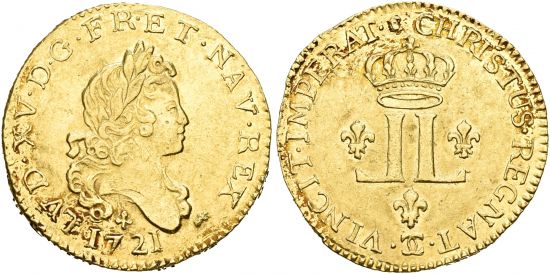 This type was struck 1720-23 from twenty-seven mints but is very rare so there is little price difference between the mints. Its face value was 54 livres, which was lowered to 39 livres 12 sols on demonetization (August 1723). This type was superseded by the louis d'or Mirliton, palmes longues, struck 1723-25. That coin in turn was superseded by the louis d'or aux lunettes, struck 1726-40.